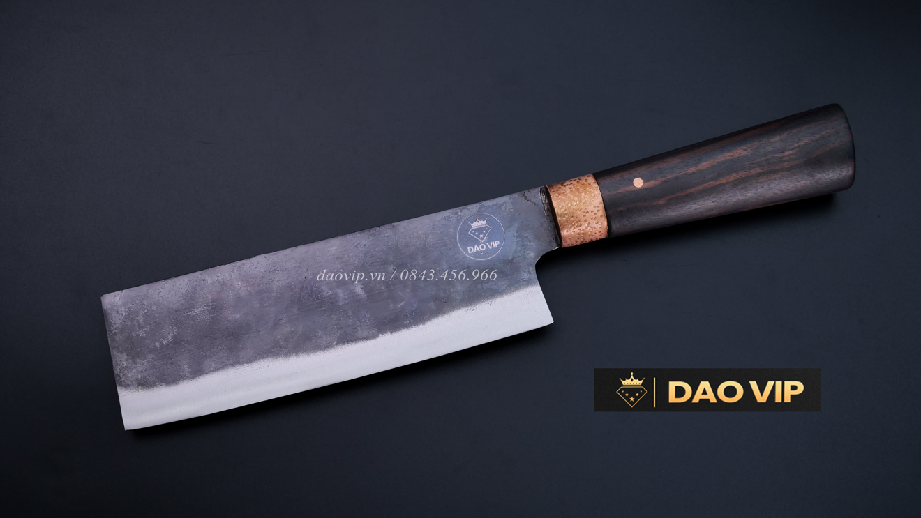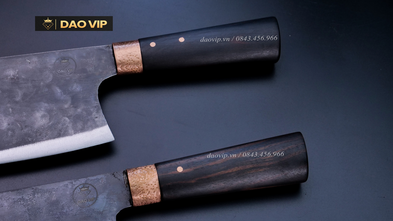 - Chất liệu của cán dao: cán dao được làm từ chất liệu gỗ mun. đây là loại gỗ thuộc phân khúc gỗ quý chuyên làm đồ thủ công mỹ nghệ, nhờ đặc tính không bị mục, bào mòn khi tiếp xúc nhiều với nước. Cán gỗ mun có cảm giác cầm đầm tay, chắc chắn. Phần khâu đồng được cắt gò text tỉ mỉ, ôm khít lấy phần đuôi của lưỡi dao, là bộ phận gắn kết quan trọng của chuôi với cán dao. Sử dụng keo AB hai thành phần để tra dao nên rất chắc chắn, hạn chế việc long cán khi sử dụng lâu năm. Chốt đồng chắc chắn.