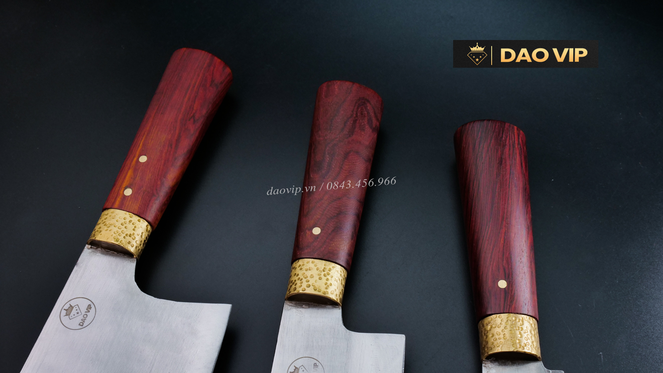 - Chất liệu của cán dao: cán dao được làm từ chất liệu gỗ Trắc. đây là loại gỗ thuộc phân khúc gỗ quý chuyên làm đồ thủ công mỹ nghệ, nhờ đặc tính không bị mục, bào mòn khi tiếp xúc nhiều với nước. Cán gỗ Trắc có cảm giác cầm đầm tay, chắc chắn. Phần khâu đồng được cắt gò text tỉ mỉ, ôm khít lấy phần đuôi của lưỡi dao, là bộ phận gắn kết quan trọng của chuôi với cán dao. Sử dụng keo AB hai thành phần để tra dao nên rất chắc chắn, hạn chế việc long cán khi sử dụng lâu năm. Chốt đồng chắc chắn.