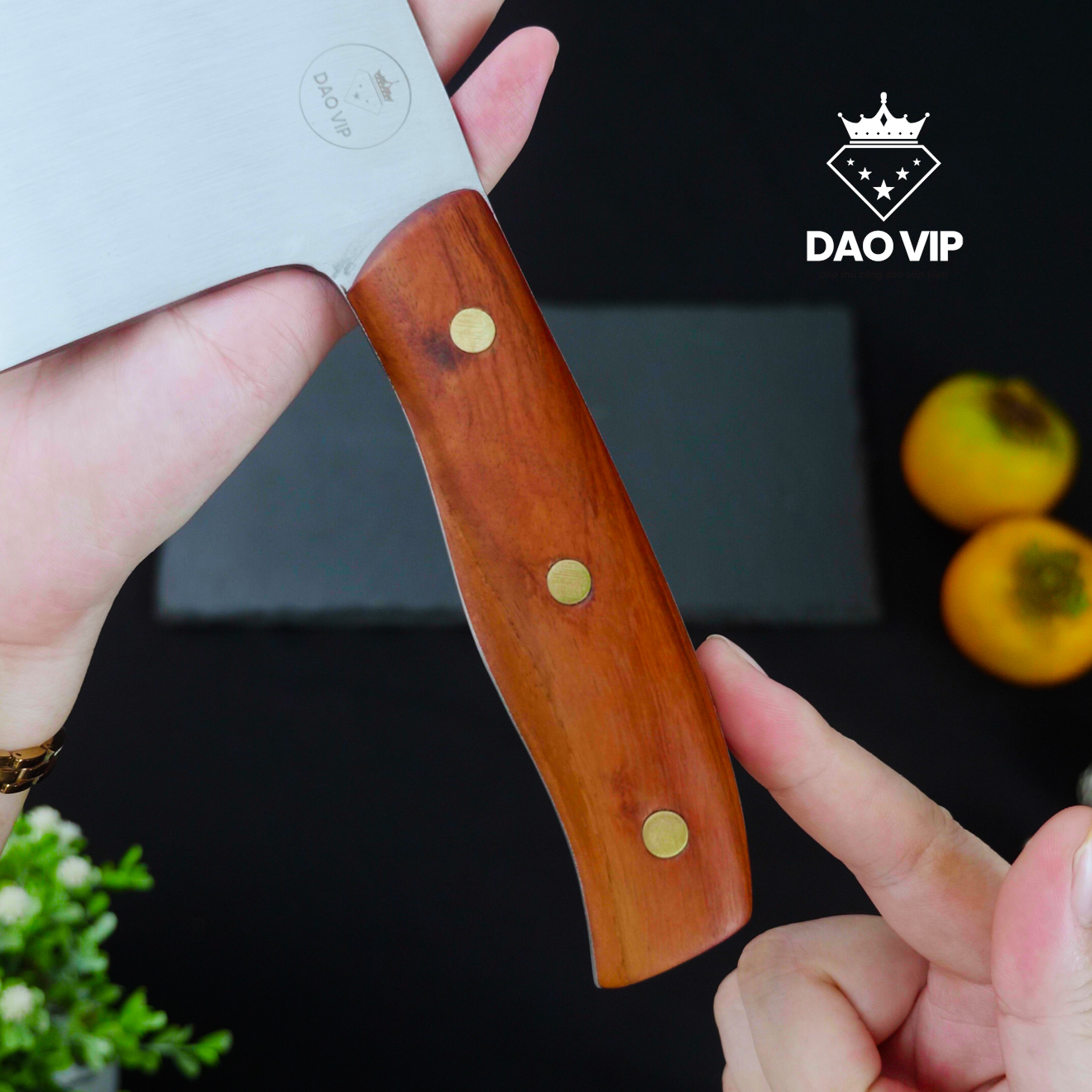 Phần cán dao được chế tác từ gỗ tự nhiên cao cấp, đã xử lý kỹ lưỡng để chống ẩm mốc và mối mọt. Thiết kế dạng ốp Full Tang kết hợp 3 chốt cố định và keo AB hai thành phần tạo sự liên kết chắc chắn, bền bỉ. Kích thước cán được tối ưu vừa vặn với lòng bàn tay, không quá lớn cũng không quá nhỏ, mang lại cảm giác cầm nắm chắc chắn, hạn chế trơn trượt ngay cả khi tay ướt hoặc sử dụng dao trong thời gian dài.
