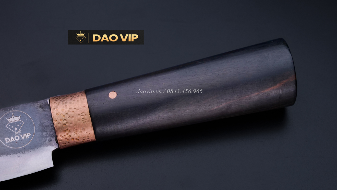 - Chất liệu của cán dao: cán dao được làm từ chất liệu gỗ mun. đây là loại gỗ thuộc phân khúc gỗ quý chuyên làm đồ thủ công mỹ nghệ, nhờ đặc tính không bị mục, bào mòn khi tiếp xúc nhiều với nước. Cán gỗ mun có cảm giác cầm đầm tay, chắc chắn. Phần khâu đồng được cắt gò text tỉ mỉ, ôm khít lấy phần đuôi của lưỡi dao, là bộ phận gắn kết quan trọng của chuôi với cán dao. Sử dụng keo AB hai thành phần để tra dao nên rất chắc chắn, hạn chế việc long cán khi sử dụng lâu năm. Dao được chốt đinh đồng chắc chắn, thẩm mĩ đảm bảo an toàn cho người dùng.