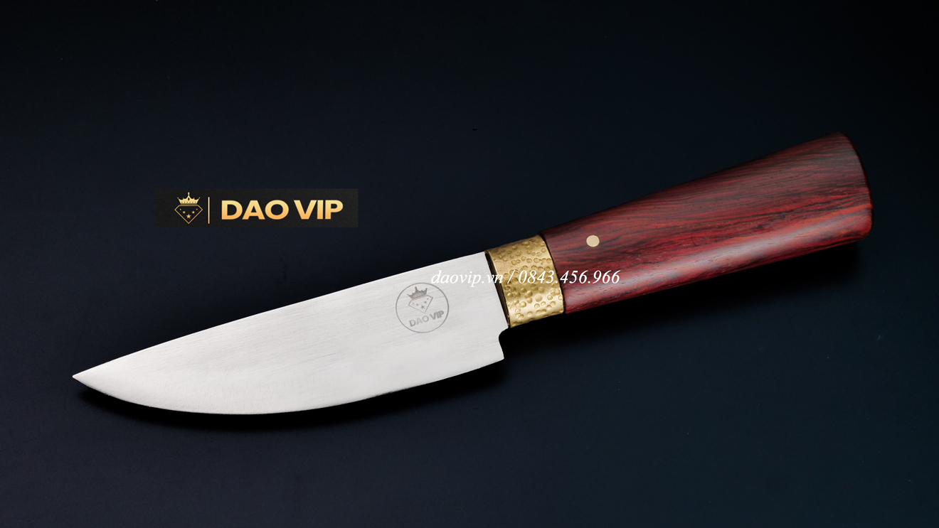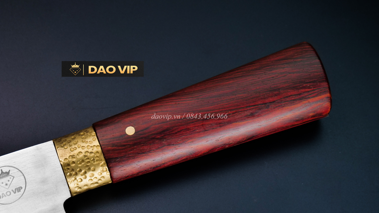 - Chất liệu của cán dao: cán dao được làm từ chất liệu gỗ Trắc. đây là loại gỗ thuộc phân khúc gỗ quý chuyên làm đồ thủ công mỹ nghệ, nhờ đặc tính không bị mục, bào mòn khi tiếp xúc nhiều với nước. Cán gỗ Trắc có cảm giác cầm đầm tay, chắc chắn. Phần khâu đồng được cắt gò text tỉ mỉ, ôm khít lấy phần đuôi của lưỡi dao, là bộ phận gắn kết quan trọng của chuôi với cán dao. Sử dụng keo AB hai thành phần để tra dao nên rất chắc chắn, hạn chế việc long cán khi sử dụng lâu năm. Dao được chốt đinh đồng chắc chắn, thẩm mĩ đảm bảo an toàn cho người dùng.