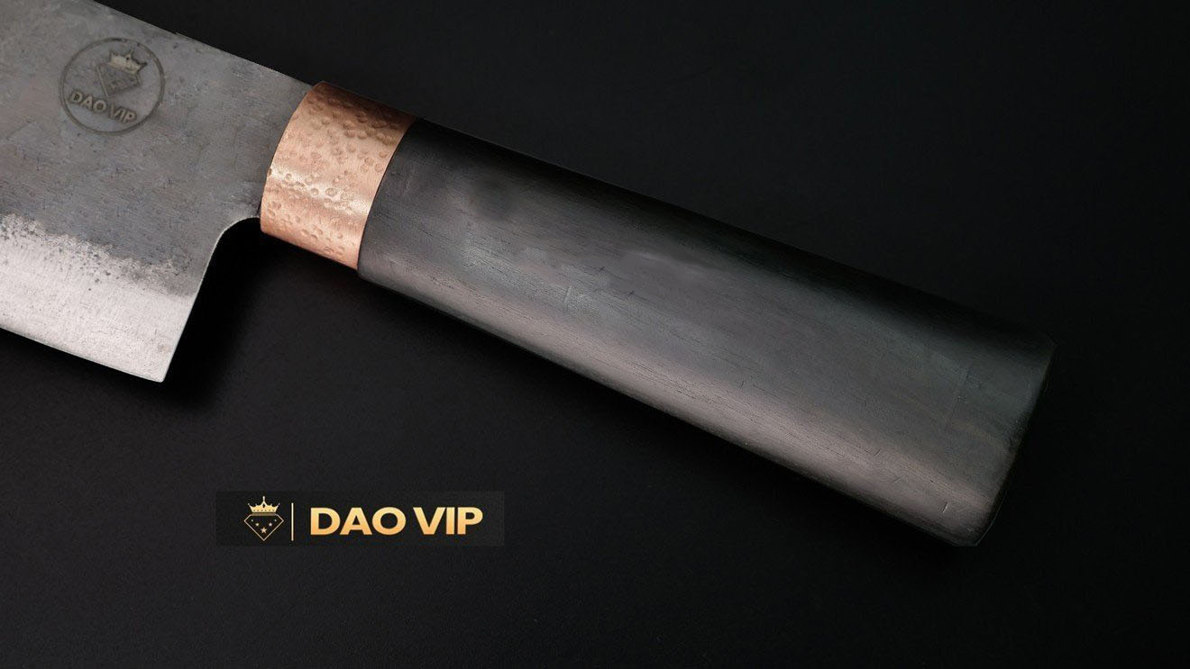 Cán dao bằng gỗ mun hình ôvan, khâu đồng gò text sang xịn