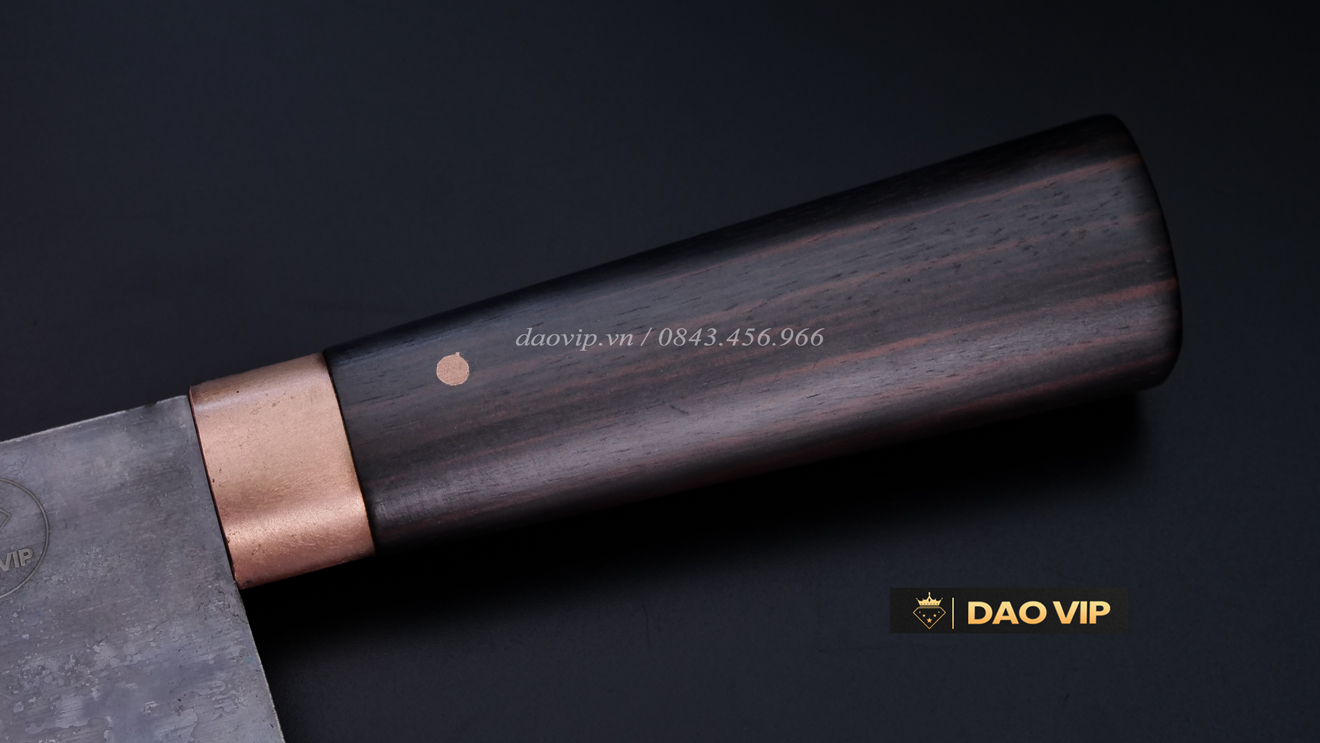 Cán dao bằng gỗ mun hình ôvan, khâu đồng gò text sang xịn