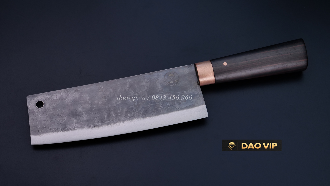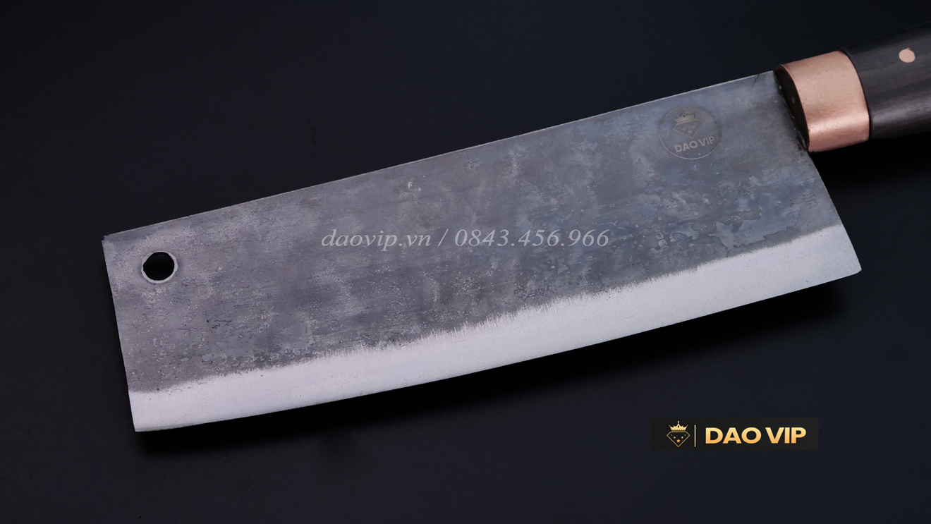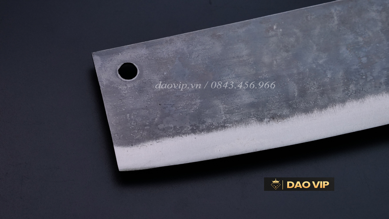 Lưỡi dao sắc bén, mũi bằng,có lỗ treo dao, tay cầm ôvan, logo thương hiệu DAO VIP